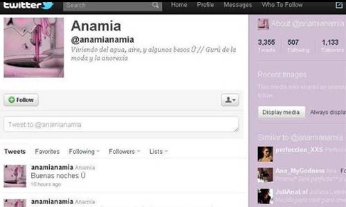 La red social Twitter se ha negado a bloquear perfiles que fomenten anorexia y bulimia, "para preservar la libertad de expresión", según ha informado el Ministerio de Sanidad, Política Social e Igualdad a través de un 'tweet' desde su perfil '@sanidadgob'. Asimismo, tras la multitudinaria respuesta de sus seguidores, contrariados por la decisión de la red de microblog, Sanidad ha anunciado que "buscará el apoyo de la UE para afrontar conjuntamente el problema del fomento de la anorexia en las redes sociales". Sanidad pidió el pasado jueves, 1 de septiembre, a la red social Twitter que utilizará "todos los mecanismos" que tuvieran en su mano para aislar, "respetando la libertad de expresión", a aquellos perfiles que fomenten la anorexia y la bulimia. La petición se formalizó a través de la Unidad de Delitos Telemáticos de la Guardia Civil y, según reconoció la propia titular del ramo, Leire Pajín, en los pasillos del Congreso, respondía a una iniciativa ciudadana. "A lo largo del verano hemos recibido mensajes en Twitter que les pedían que actuasen ante la proliferación de 'tweets' en favor de la anorexia", afirmaba, al tiempo que explicaba que "las nuevas tecnologías y redes sociales son una fabulosa herramienta de comunicación pero también pueden ser utilizadas con objetivos nocivos para la sociedad y la salud de los ciudadanos". Aunque la publicación de estos mensajes no constituye ningún delito, desde su departamento recuerdan que tienen "una incidencia negativa en la población joven", de ahí que, pese a la decisión de Twitter, vayan seguir vigilantes y realizarán un rastreo periódico en busca de mensajes o cuentas susceptibles de ser retiradas.