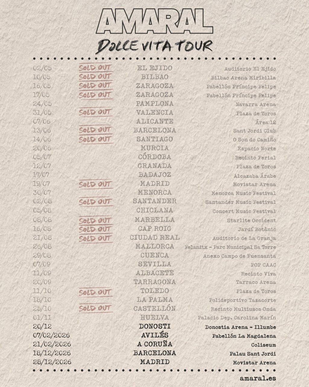 La gira continúa con normalidad y el planteamiento es el que tiene sentido: canciones del último ciclo (Dolce Vita) y clásicos que llevan años funcionando como banda sonora generacional. Lo interesante aquí no es la etiqueta —pop-rock, indie, lo que toque— sino esa capacidad de Amaral para sonar íntimos en recintos grandes, como si te cantaran a dos metros aunque estés en grada.