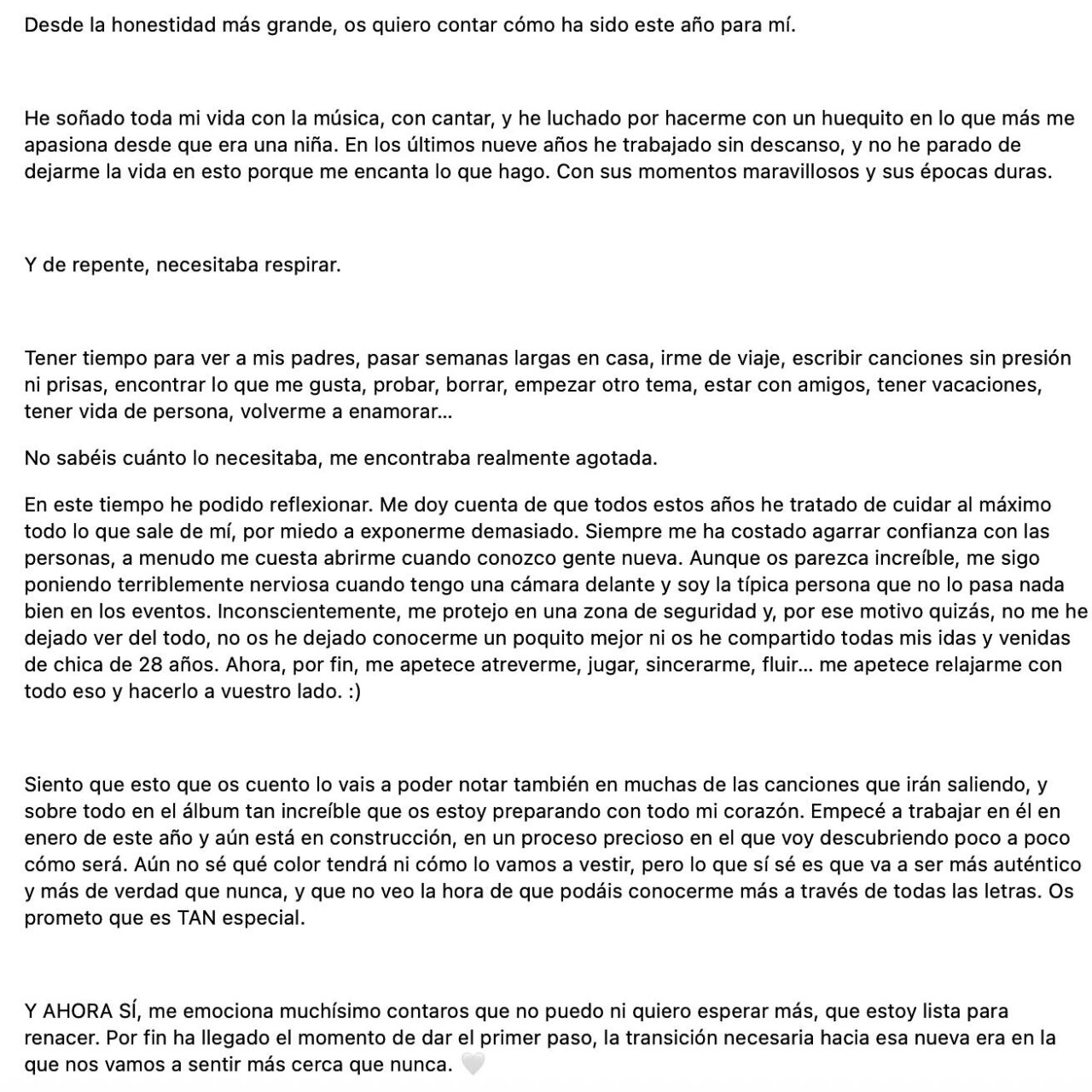 Con esta publicación, la cantante reconoce que hasta ahora había puesto una coraza frente al público, pero que a partir de ahora quiere mostrarse más vulnerable, auténtica y cercana.