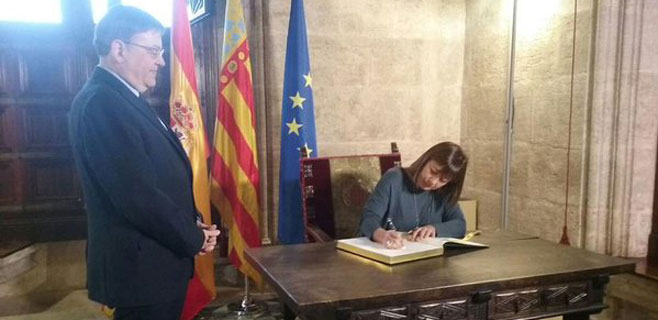 Esta reunión con el presidente de la Generalitat Valenciana es la primera que mantiene Armengol con un homólogo suyo de otra comunidad autónoma. Al inicio de su encuentro, la presidenta del Govern ha aprovechado para firmar el libro de honor del Palau de la Generalitat Valenciana.