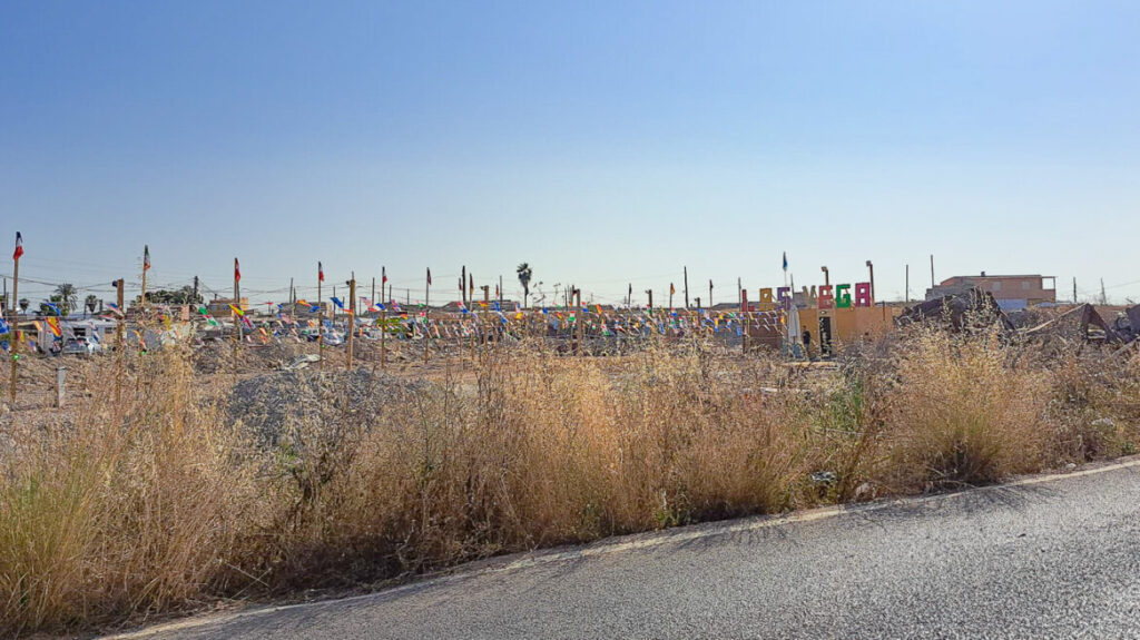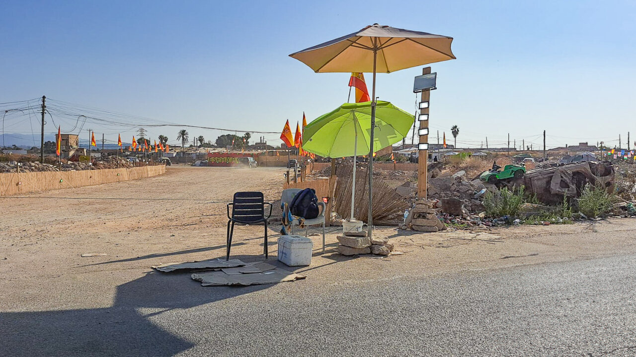 A la entrada, una sombrilla verde bajo la que hay varias sillas de plástico, cobija del sol al ‘portero’ de la ‘urbanización’, que a modo de aparcacoches y dando manotazos al aire, se apresura a dirigir el tráfico hacia el interior del poblado en cuanto ve aproximarse un vehículo. Los narcos han vuelto a reconstruir, por enésima vez, las barracas utilizadas como puntos de venta, utilizando enormes láminas de madera contrachapada que luego pintan con los colores de la bandera de España y decoran en su exterior con luces de colores.