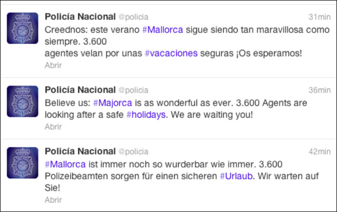 El tweet ha sido enviado en castellano, inglés y alemán, en el que se recuerda que más de 3.600 agentes velarán por la seguridad de todos los visitantes de Mallorca. "Creednos: este verano #Mallorca sigue siendo tan maravillosa como siempre. 3.600 agentes velan por unas #vacaciones seguras ¡Os esperamos!" reza el post de la Policía Nacional.