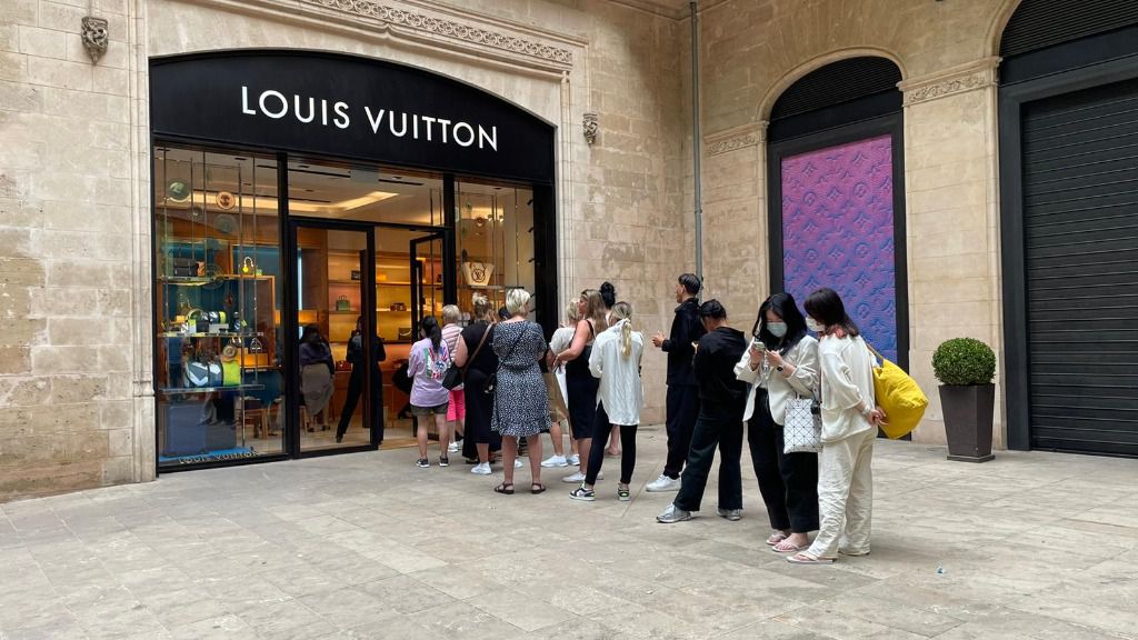 Estos días, comercios de lujo de Palma como el de la fotografía registran colas con esperas en la calle de muchos minutos antes de poder entrar. Hablamos de firmas donde un bolso no baja de los 1.000 euros y unas gafas o un pañuelo no se pueden adquirir por menos de 300.