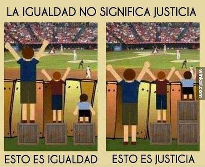A veces los términos suenan igual, pero no son lo mismo. Circula en las redes un ejemplo gráfico para tomar conciencia de la diferencia que puede suponer la justicia y la igualdad. En unos días en que se habla de si todos somos "iguales" ante la ley y si eso significa hacer "justicia", este ejemplo claro despeja dudas y deja muy claro que no siempre es lo mismo.