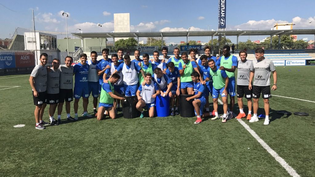 La plantilla realizó la penúltima sesión de entrenamiento antes de recibir el domingo a las 12:00 horas al Olot. Han participado en una sesión distendida de varias actividades de juegos todos, a excepción de Julio Delgado. En la foto se aprecia como los peor clasificados en los ejercicios, Carl, Rico y Marcel, han sido cariñosamente castigados a meterse en el cubo. Kike y Uche ultimas su proceso de recuperación y siguen evolucionando bien. Sergio Sánchez se une a los otros 18 por lo que el entrenador deberá descartar a uno para el partido del Olot. Al término de la sesión, el entrenador y el jugador Nacho Heras han atendido a los medios: