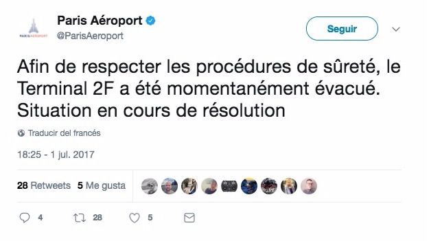 Las autoridades han confirmado, a través de las redes sociales, que la terminal 2F ha sido momentáneamente evacuada “para respetar los procedimientos de seguridad”, y que la situación está “en vías de solución”.