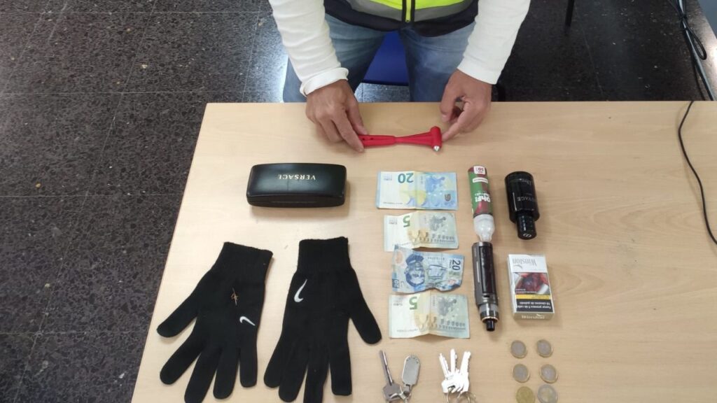 Los policías efectuaron un registro a los menores y localizaron un teléfono móvil de alta gama, perfumes, un vaper, varios billetes, un estuche de gafas y otros efectos, interviniendo los mismos junto con los guantes y el martillo rompelunas. Después comprobaron que el teléfono móvil provenía de otro robo en interior de vehículo perpetrado el 14 de marzo.