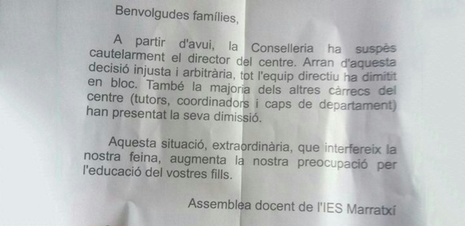 La asamblea de docentes del IES Marratxí ha hecho llegar a los alumnos una nota explicativa de la situación, anunciando su preocupación por el devenir de la educación de los niños.