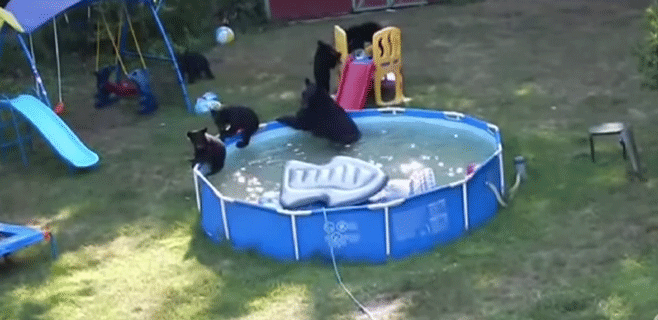 La escena es tan sorprendente como increíble y entrañable. Una familia de osos se coló en el jardín de una casa ubicada en Nueva Jersey, Estados Unidos, y lejos de causar destrozos a aquello con lo que se encontraron, comenzaron a regocijarse y empezar a jugar. La pareja y sus cuatro crías aprovecharon los toboganes y columpios del lugar para pasarlo en grande instantes antes de darse un baño en la piscina colocada en el jardín. Fue una hora de puro disfrute antes de volver a su hábitat. Las imágenes fueron grabadas por la propia dueña de la casa.