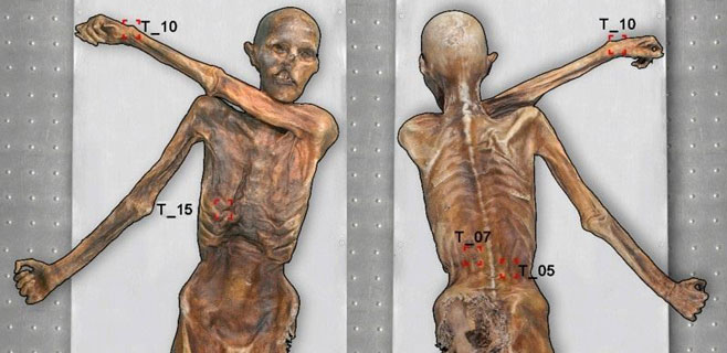 Con una técnica fotográfica no invasiva, investigadores han registrado todos los tatuajes del conocido como el Hombre de Hielo Ötzi, encontrado preservado en un glaciar de los Alpes. En el proceso han tropezado con un tatuaje antes desconocido en su caja torácica. Este tatuaje es muy difícil de distinguir a simple vista porque su piel se ha oscurecido mucho con el tiempo. La tecnología fotográfica más sofisticada ahora ha permitido identificar también los tatuajes en las capas profundas de la piel.