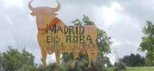 El toro de Osborne, que se encuentra en la entrada de Montuïri en Mallorca, ha aparecido con la senyera al cuello, dentro de la campaña 'Enllaçats per el catalá' y con una pintada en la que se puede leer 'A Mallorca en català' encima de la que se escribió en las pasadas elecciones generales 'Madrid ens roba', según ha informado la página Vilaweb.