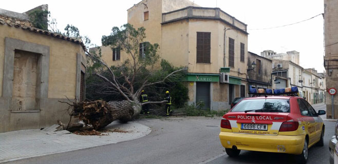 La imagen obtenida por mallorcadiario.com muestra la virulencia con la que el viento se ha cebado en algunos puntos de Mallorca en las últimas horas. Es el caso de Felanitx, donde este árbol de grandes dimensiones se ha venido abajo y -no se aprecia en la fotografía- se ha precipitado sobre un coche que se encontraba estacionado en la calle de al lado y al que ha causado serios desperfectos.