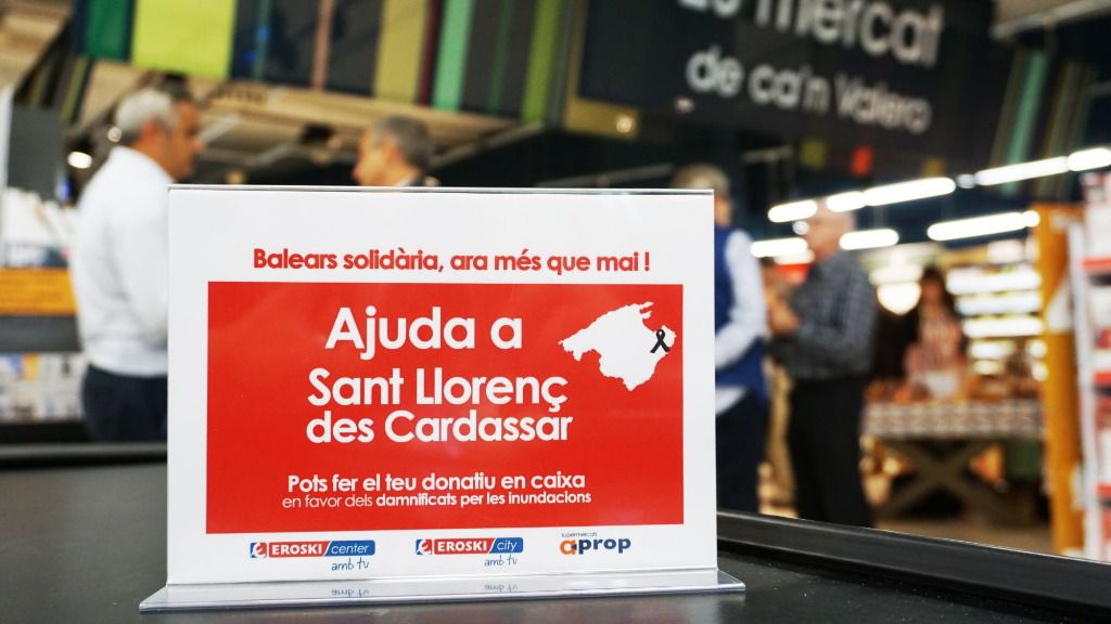 EROSKI puso en marcha el pasado viernes día 12 en todos sus supermercados e hipermercados una campaña para recaudar fondos a favor de los damnificados por las inundaciones de Mallorca. La campaña ya ha recaudado 125.000 euros y hasta el día 28 de este mes de octubre, los clientes de Eroski pueden hacer un donativo voluntario en las mismas cajas de todos los supermercados, para ayudar a cubrir las necesidades básicas de la población afectada .