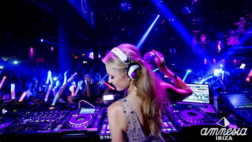 Paris Hilton durante una sesión de DJ en la cabina de Amnesia