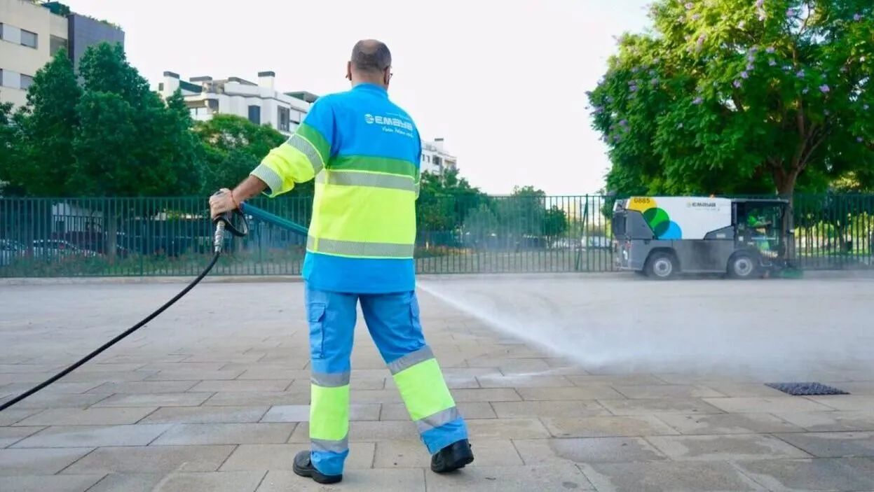 Operario de Emaya baldea una calle en Palma.