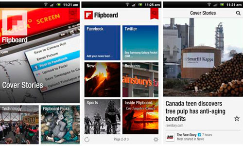 Flipboard recoge el contenido de las redes sociales y otros sitios web y lo presenta en formato de revista. Permite a los usuarios hacer un recorrido a través de su 'feed' en las redes sociales y se alimenta de los sitios web que se han asociado.
