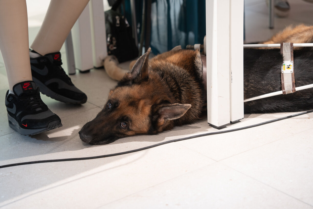 Un perro descansa en el evento de Mallorcadiario mientras las personas interactúan.