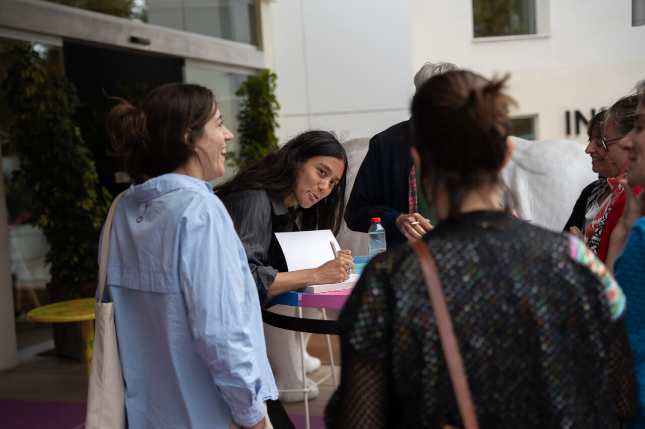 Una autora interactúa con los asistentes mientras firma libros en el Festival FLEM.