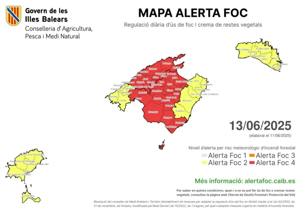 La isla en la que el riesgo es mayor es Mallorca, sobre todo en el interior y el norte, donde la alerta se incrementa hasta el nivel máximo, que es el nivel 4. Mientras, en Menorca, Ibiza y Formentera se establece el nivel 2 (riesgo de moderado a alto).