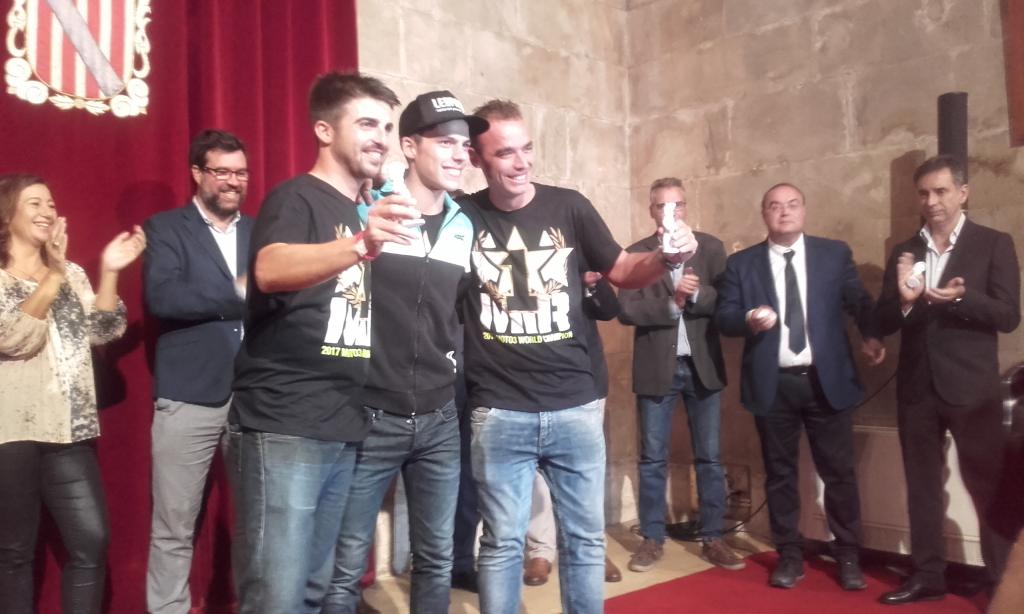 Ya en el Consolat de Mar, ha recibido de manos de las autoridades diferentes obsequios y se ha dirigido a los allí congregados para posteriormente asomarse al balcón para celebrar con los allí reunidos ,a pesar de la lluvia, su título de Moto3.