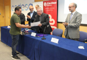 El Obispo de Mallorca, Sebastià Taltavull, y el director general de la Fundación Endesa en Baleares, Martí Ribas, han entregado este martes a 16 alumnos los diplomas acreditativos de su formación en el curso ‘Operaciones auxiliares de montaje de instalaciones electrotécnicas y de telecomunicaciones en edificios» 154