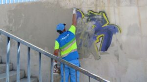 Emaya ha eliminado pintadas incívicas en 15 espacios de la ciudad con el nuevo Plan de choque que persigue borrar de fachadas, muros, calles y plazas las agresiones vandálicas. 125