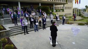 La entrada de acceso a las dependencias del Ayuntamiento de Calvià ha acogido este martes, como viene ocurriendo todos los meses, el acto de rechazo a la violencia contra las mujeres, en recuerdo y homenaje a las víctimas asesinadas por sus parejas o exparejas. 68