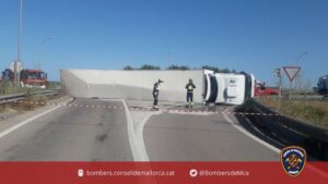 La conductora de un trailer ha resultado herida grave tras volcar su vehículo en la salida de Son Noguera en dirección a la autopista de Llucmajor. 968