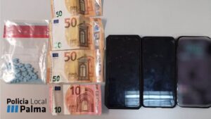 La Policía Local de Palma ha denunciado a tres jóvenes, dos de 18 años y uno de 17, por un delito contra la salud pública al ser sorprendidos con 23 pastillas, además de tres móviles y 160 euros en efectivo. 69