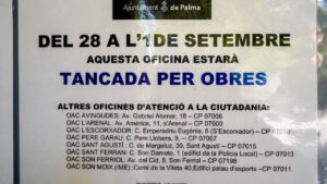 El área de gestión tributaria y la OAC de Santa Eulàlia, permanecerán cerradas a partir de este 28 de agosto debido a las obras en el edificio del Ayuntamiento de Palma. La oficina para pagar las tasas municipales se trasladará de forma provisional a la calle Joan Maragall a partir del 4 de septiembre. 112