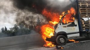 Susto en la autopista de Inca este miércoles. Una furgoneta que transportaba palés ha comenzado a arder en pleno trayecto y el conductor ha tenido que parar. 2.215