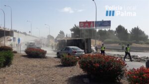 Un camión que transportaba cemento ha volcado este viernes en una de las rotondas que dan acceso a la Vía de Cintura, en el Camí de Jesús, lo que ha provocado retenciones en la zona. 293