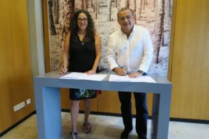 El alcalde de Calvià, Afonso Rodríguez Badal, y la directora general de la Fundació Deixalles, Francesca Maria Martí, han firmado un convenio por el cual el Ayuntamiento cede gratuitamente por 30 años un solar a la Fundació Deixalles para la construcción de un centro de prevención de residuos e inclusión social. 88