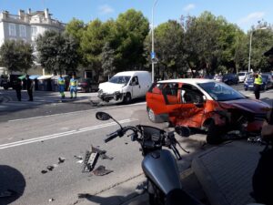 Espectacular persecución en el Coll d’en Rebassa. Una furgoneta se ha dado a la fuga en Palma tras recibir el alto en un control policial y ha terminado chocando contra un turismo. El siniestro ha provocado gran revuelo en el barrio, como indican testigos a mallorcadiario.com 1.778