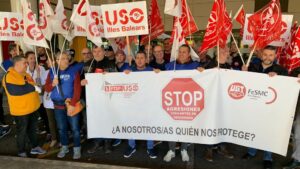 Medio centenar de sindicalistas de USO FTSP-USO Illes Balears han exigido este lunes en el hospital de Son Espases de Palma que las instituciones se impliquen con medios técnicos y medidas legales en en la protección de los trabajadores de seguridad privada que trabajan en centros sanitarios. 551