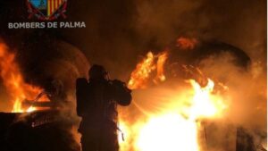 Un incendio en un solar situado en s’Arenal de Playa de Palma ha calcinado esta madrugada dos hormigoneras. La combustión de los neumáticos quemados y los aceites de estas máquinas han avivado el fuego. 217