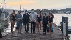 Las exmedallistas olímpicas en la disciplina de natación sincronizada por el equipo nacional Paula Klamburg, Clara Basiana y Ona Carbonell realizaron anoche una demostración acuática para conmemorar los 30 años de la colocación de la escultura de la «Sirenita» en el puerto de Maó. 253