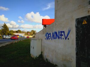 Primero fue la Serra, después Calvià, ahora es el Arenal y también la carretera del aeropuerto. Demon F.V. insiste en atiborrar la isla con su firma en muros y graffitis ajenos, pero ¿quién es? 2.637