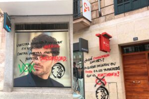 Mensajes contra Ciudadanos y Vox en sus sedes de Palma en menos de 24 horas. Ambas formaciones han denunciado la aparición de pintadas vandálicas con mensajes firmados supuestamente por Juventud Frente Obrero. 423