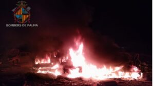 Incendio de grandes dimensiones, este martes de madrugada, en el poblado de Son Banya, en Palma, tras arder una gran cantidad de basura y escombrosos depositados en la zona. Los Bomberos de Palma han debido trabajar a destajo para contener las llamas, que también han afectado a tres vehículos abandonados. 410