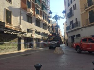 El desprendimiento de unas tejas y fiolas en un edificio situado en la zona de la calle Sindicat de Palma, ha obligado a actuar a los bomberos de Palma que han acordonado un espacio de esta calle para evitar nuevas caídas de materiales. 217
