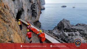 Accidente en sa Calobra, en el término municipal de Escorca, donde una mujer de nacionalidad alemana fue víctima de una caída y, según una primera valoración inicial, sufrió una rotura de tibia y peroné. Los Bomberos de Mallorca procedieron a rescatarla. 199