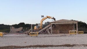 Comienza el derribo de los chiringuitos de Es Trenc. Este lunes por la tarde han arrancado las labores de retirada de materiales de los emblemáticos puestos. En total son seis. 540