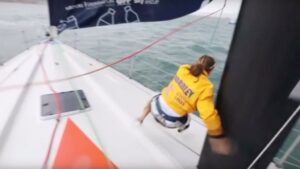 La regatista del ‘Turn the Tide on Plastic’ Liz Wardley tuvo un suerte de escapar cuando su pierna quedó atrapada en la escota del genaker, cuando se hacia la maniobra de virada, lo que provocó que la arrastraran a gran velocidad a través del barco. 59