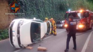 Una mujer ha tenido que ser rescatada este viernes por la tarde tras volcar con su coche en la calle Joan Miró de Palma. Al tomar una curva ha perdido el control y el vehículo ha quedado tumbado. 334