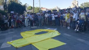 Unas 70 personas han rechazado este sábado el «ataque» con pintura a la obra de Santiago Serra ‘Presos políticos’ en una concentración en la plaza de España que ha dado comienzo sobre las 18.30 horas. 179
