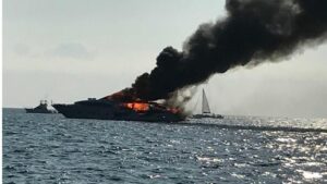 Un yate de grandes dimensiones ha ardido el mediodía del sábado frente a la playa de Es Trenc, donde se hallaba fondeado. 2.499