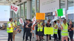 Alrededor de una veintena de trabajadores, tanto de EasyJet como también de Ryanair, se han concentrado este viernes, en el exterior de la terminal de salidas del aeropuerto de Son Sant Joan, en Palma, para denunciar que ambas aerolíneas «vulneran el derecho a huelga». 120