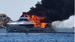 Efectivos de Salvamento Marítimo trabajan, al filo de las 20.00 horas de este jueves, en la extinción del incendio declarado a bordo de un yate de 45 metros de eslora que se halla fondeado en aguas de Formentera, y concretamente en la zona de Cala Saona. 1.648