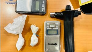 Un hombre ha sido detenido en Maó acusado de un delito contra la salud pública, después de que la Policía le interviniera 17 gramos de cocaína, dos básculas y diversos objetos que utilizaba para preparar y vender drogas. 94